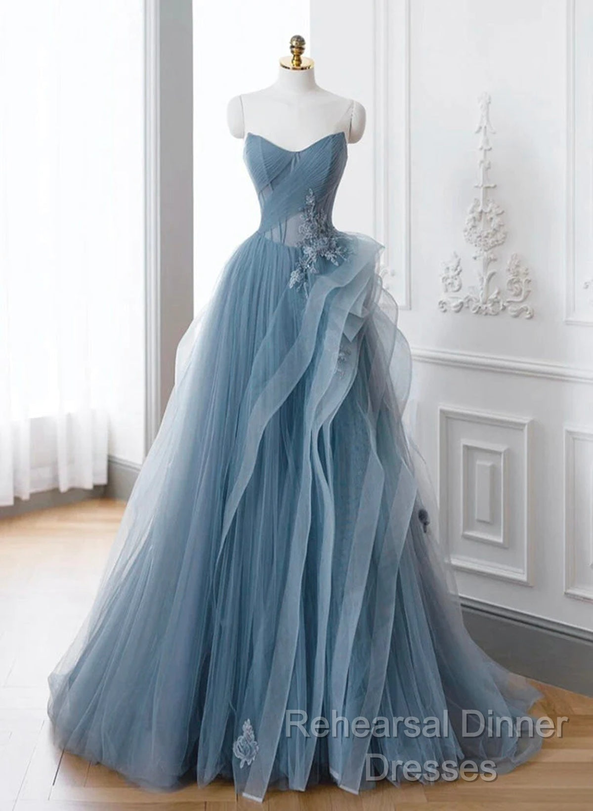 A-Line Blue Tulle Long Party Dress With Lace, Off Shoulder Tulle Semi Formal Prom Dress