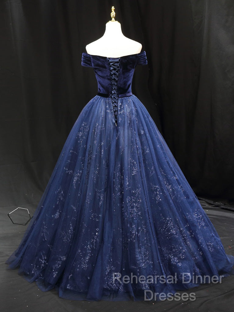 A-Line Blue Tulle Velvet Long Semi Formal Prom Dress, Blue Formal Evening Dress