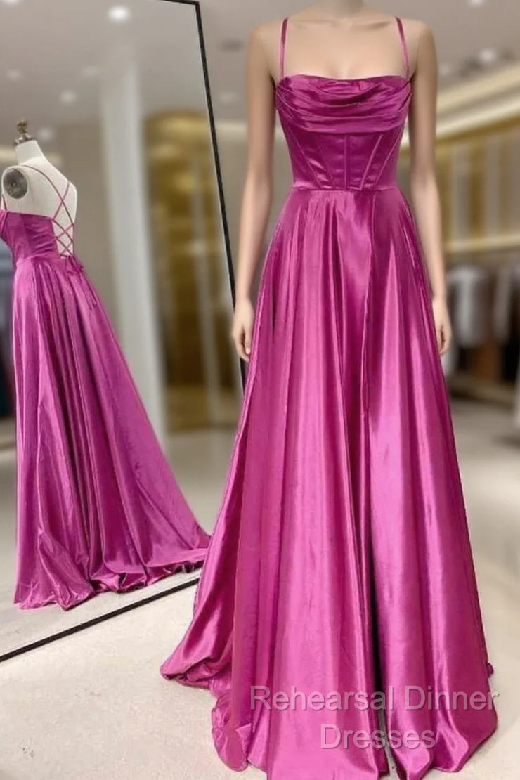 A-Line Fuchsia Semi Formal Prom Dress Ruched Long Evening Dress Spaghetti Straps