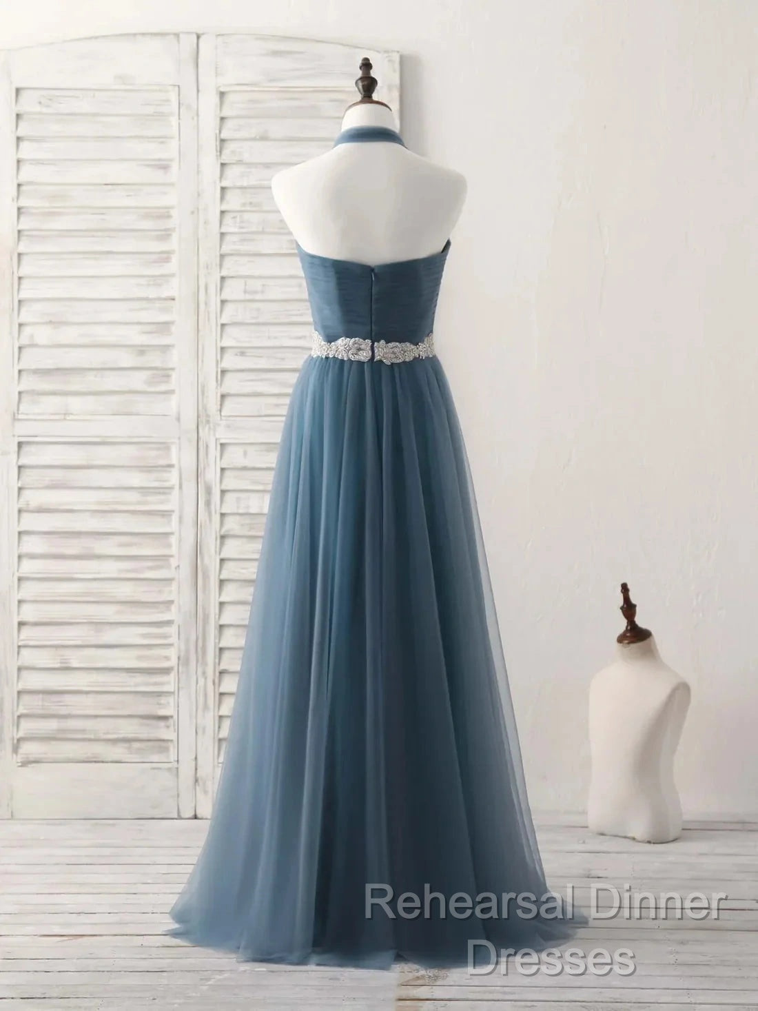 A-Line Gray Blue Tulle Long Bridesmaid Dress Floor-Length Beading Semi Formal Prom Dress Elegant