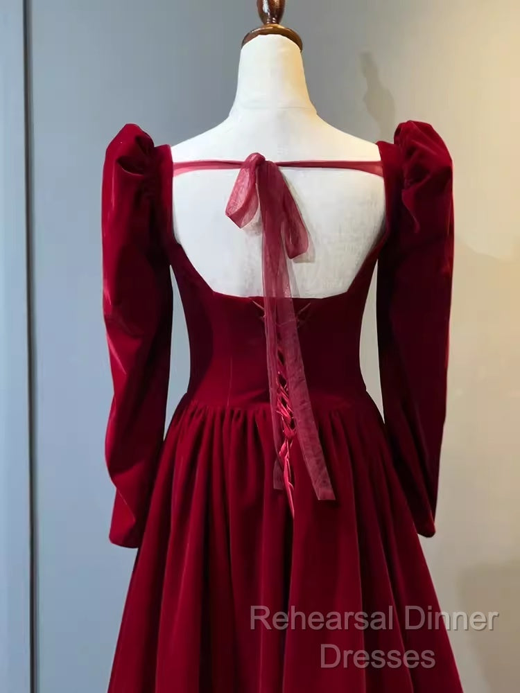 A Line Long Sleeves Red Velvet Semi Formal Prom Dresses