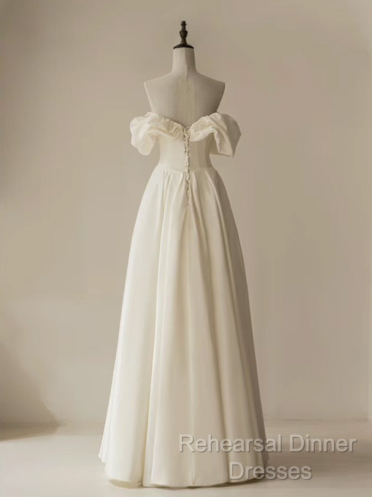 A-Line Off Shoulder Ivory Satin Long Semi Formal Prom Dress, Ivory Long Formal Dress