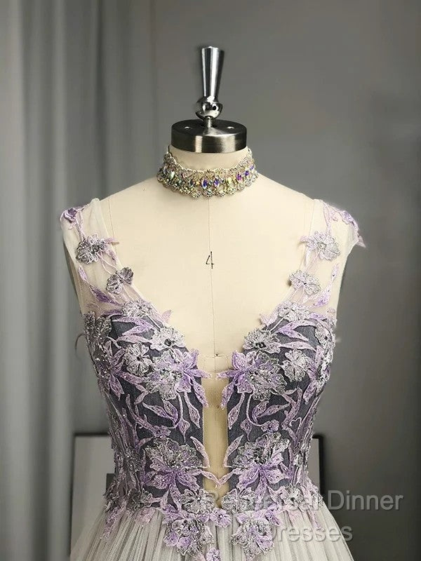 A-Line/Princess V-Neck Tulle Applique Sleeveless Floor-Length Semi Formal Prom Dresses