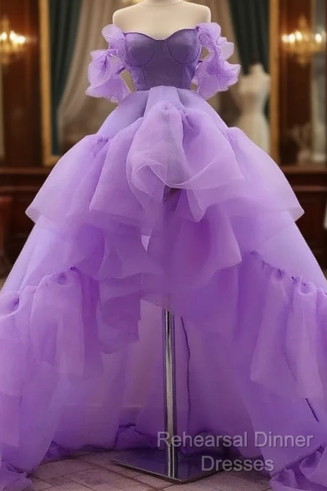 A-Line Semi Formal Prom Dresses High Low Dress Quinceanera Asymmetrical Purple Short Sleeve Off Shoulder Tulle With Tier