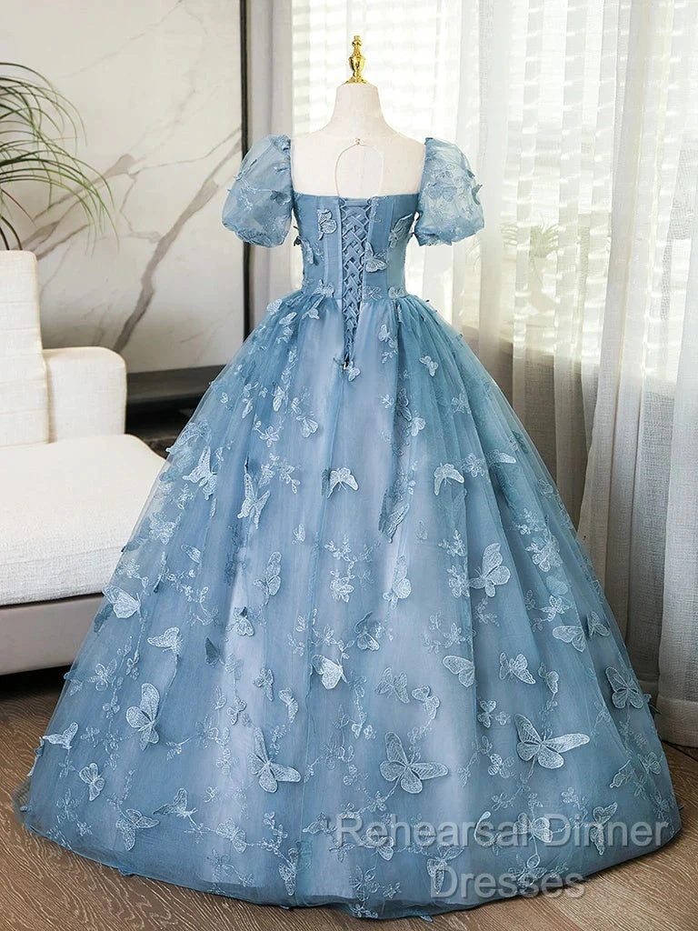 A-Line Puff Sleeves Lace Gray Blue Long Semi Formal Prom Dress, Gray Blue Formal Dress