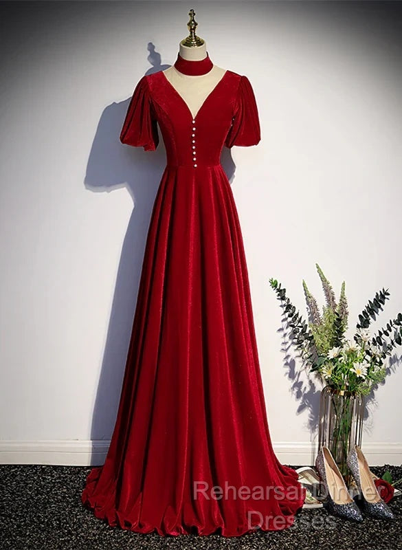 A-Line Red High Neckline Velvet Long Party Dress Short Sleeves Velvet Semi Formal Prom Dress