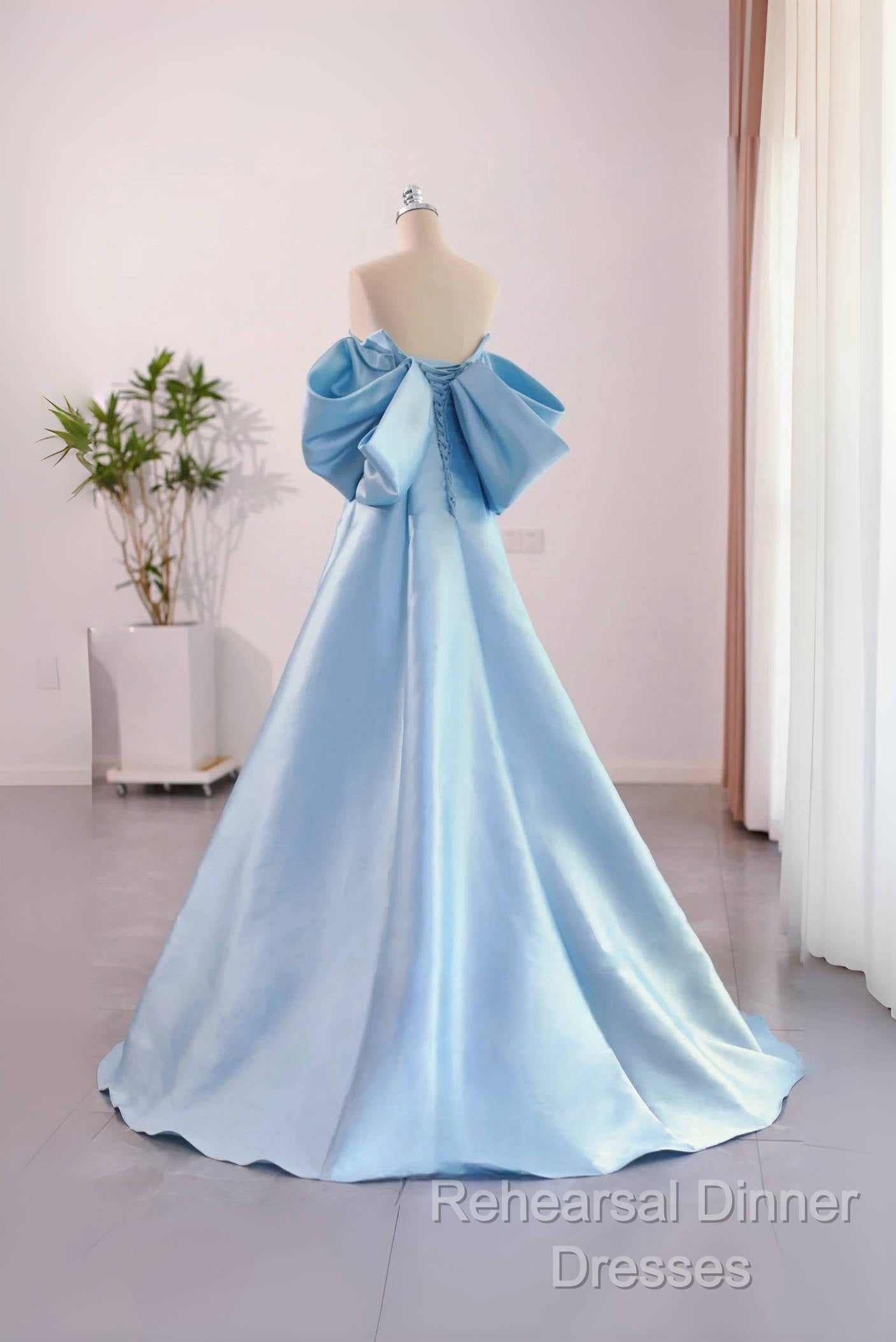A-Line Satin Blue Long Semi Formal Prom Dress With Bow