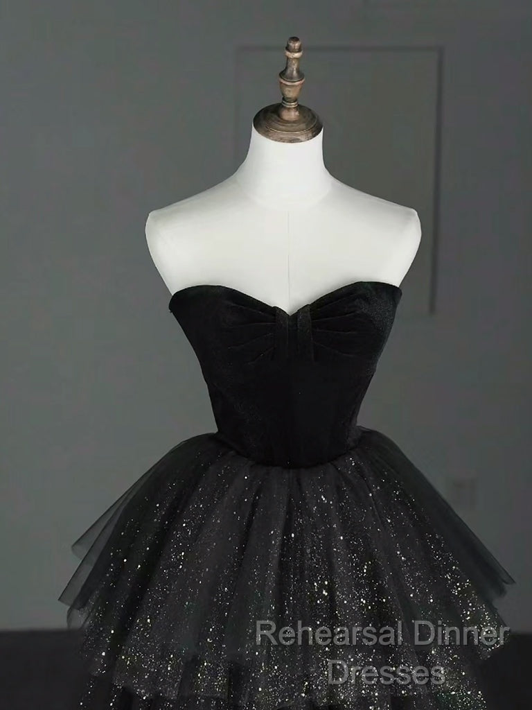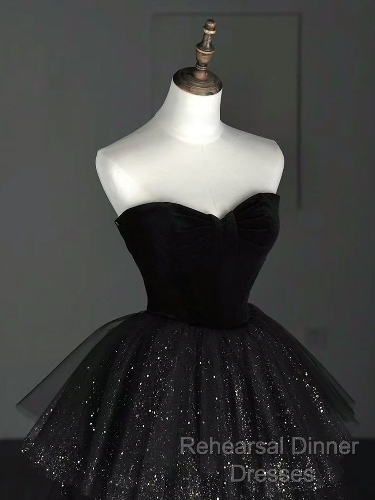 A-Line Sweetheart Neck Tulle Velvet Black Long Semi Formal Prom Dress, Black Evening Dress