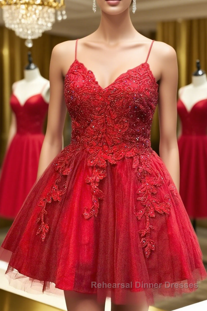 A Line V Neck Backless Lace Red Short Semi Formal Prom Dresses Homecoming Dresses, Backless Red Lace Formal Graduation Evening Dresses