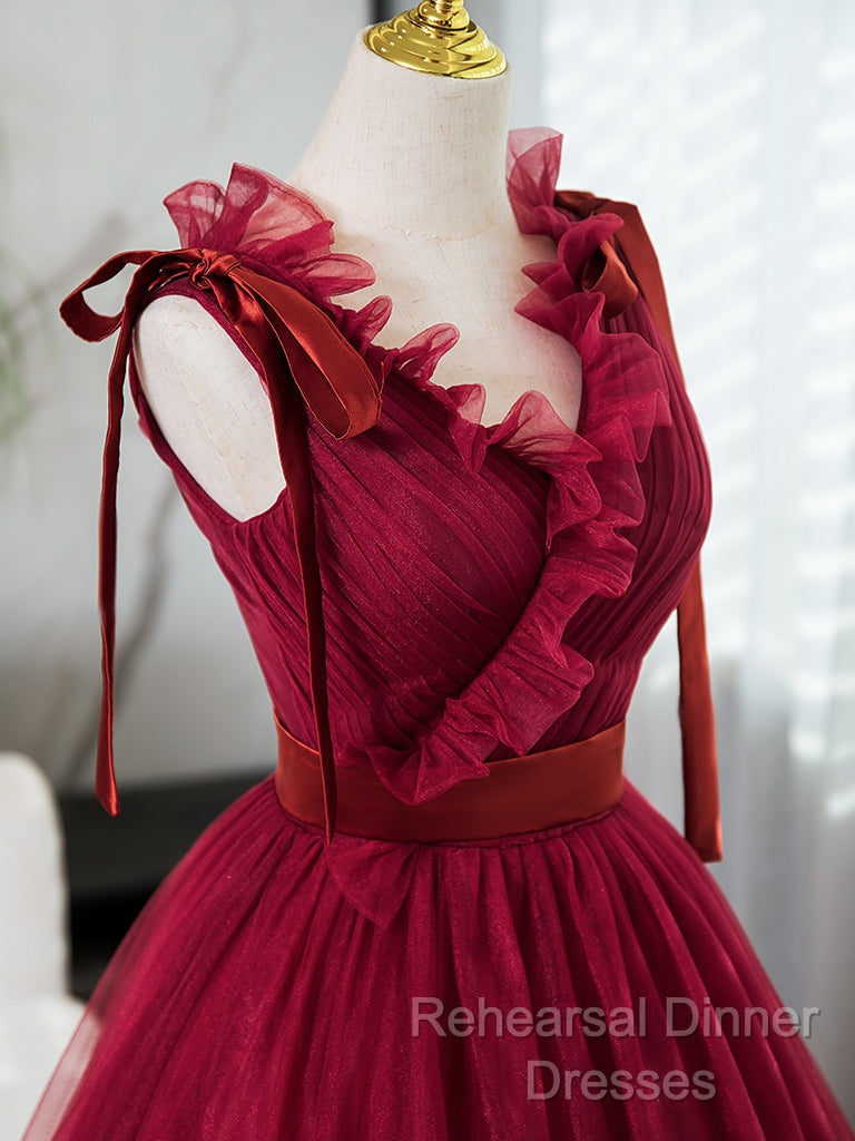 A-Line V Neck Tulle Burgundy Long Semi Formal Prom Dress, Burgundy Long Evening Dress