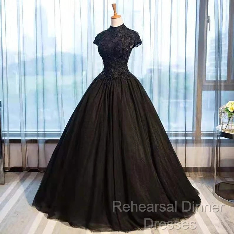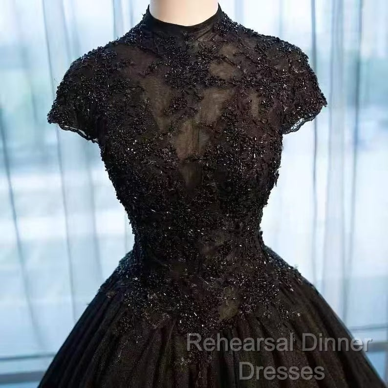 Beautiful Black Cap Sleeves Long Tulle Party Dress, Black Semi Formal Prom Dress