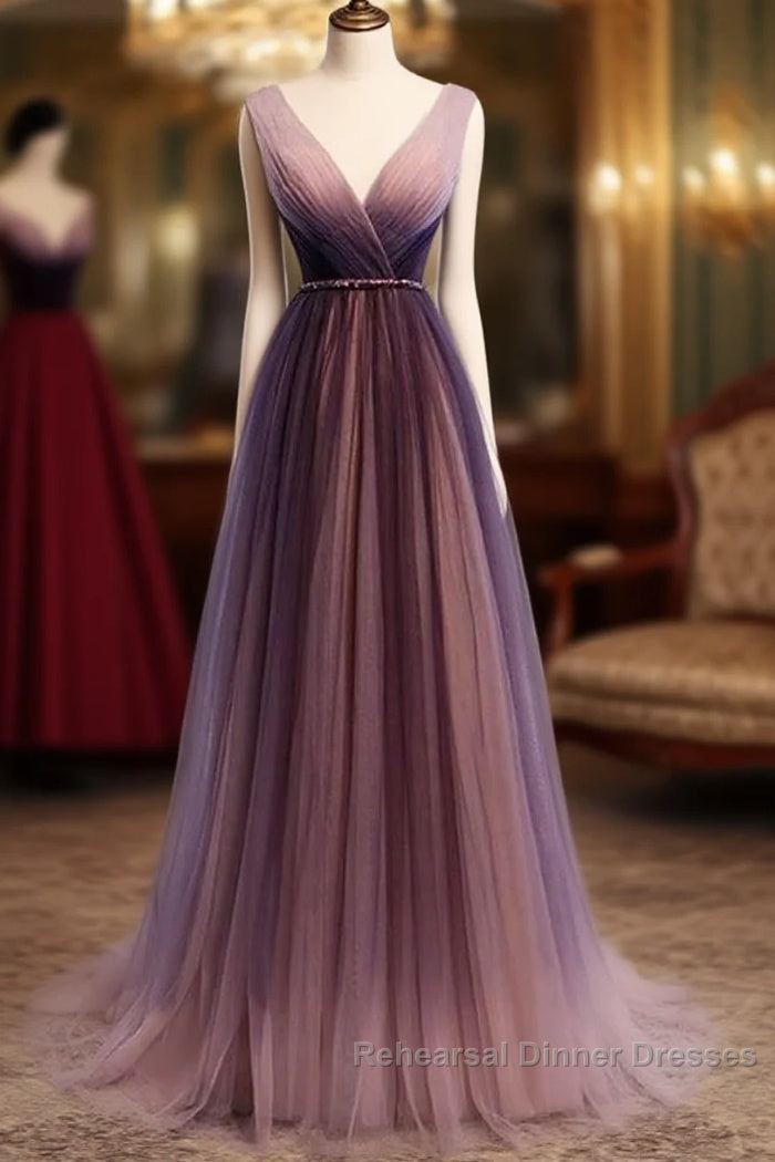 Beautiful Gradient V-Neckline Tulle Long Semi Formal Prom Dress Party Dress, Gradient Evening Gown