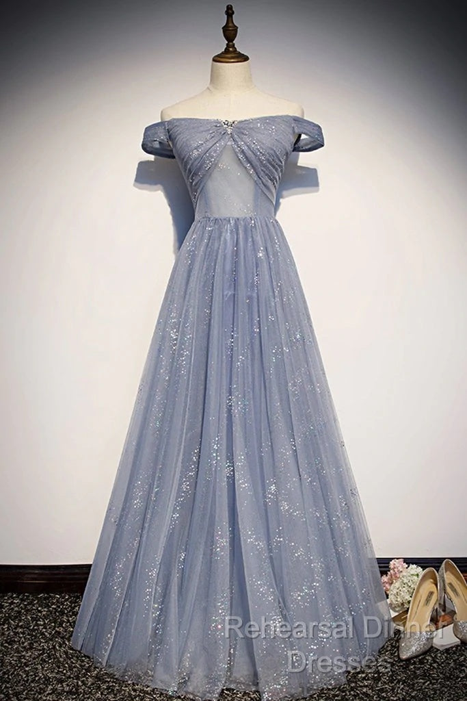 Beautiful Long Strapless Blue Tulle Beaded Long, A Line Off Shoulder Semi Formal Prom Dress