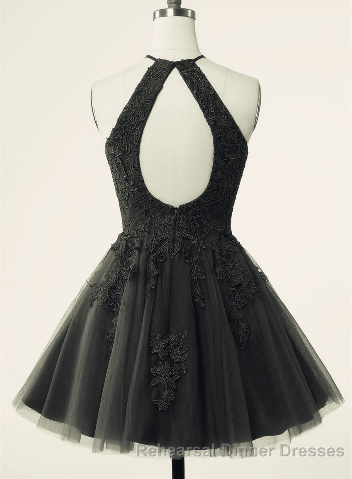 Black Halter Tulle With Lace Short Party Dress, Black Tulle Homecoming Dress