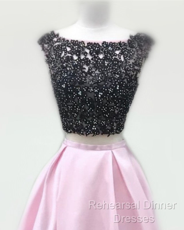 Black Lace Beaded Two Piece Satin Semi Formal Prom Dresses