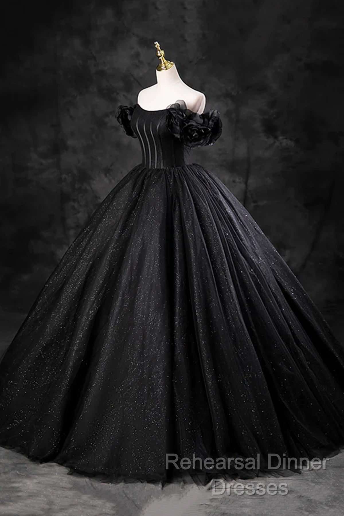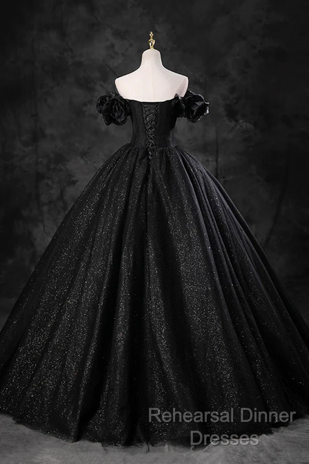 Black Off Shoulder Tulle Lace-Up Sweet 16 Dress, Black Long Party Dress Semi Formal Prom Dress