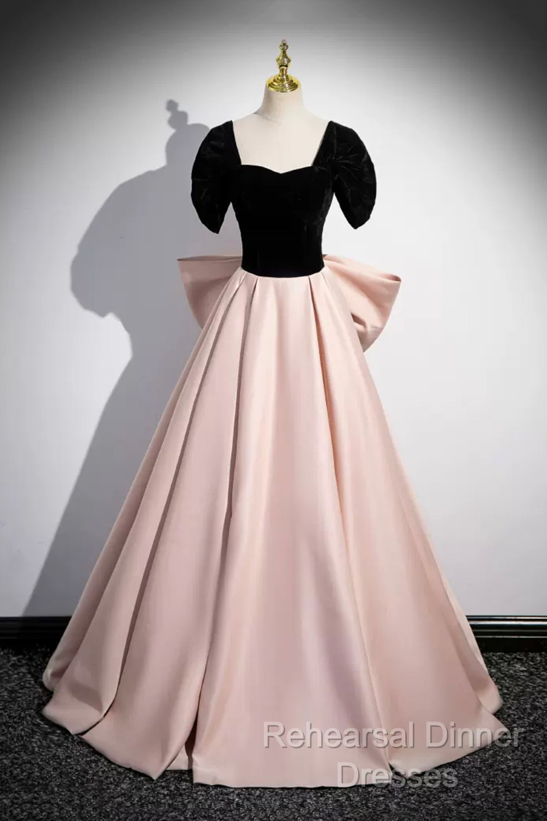 Black Velvet And Pink Satin Long Semi Formal Prom Dress, Beautiful A-Line Evening Party Dress With Bow