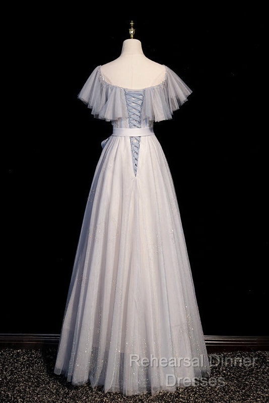 Blue And Pink Beaded Tulle Lovely A-Line Long Party Dress, Tulle Evening Dresses Semi Formal Prom Dresses