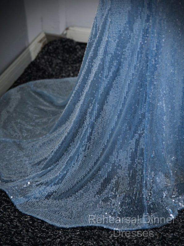 Blue Mermaid Sequin Sheer Straps Scalloped Long Semi Formal Prom Dress