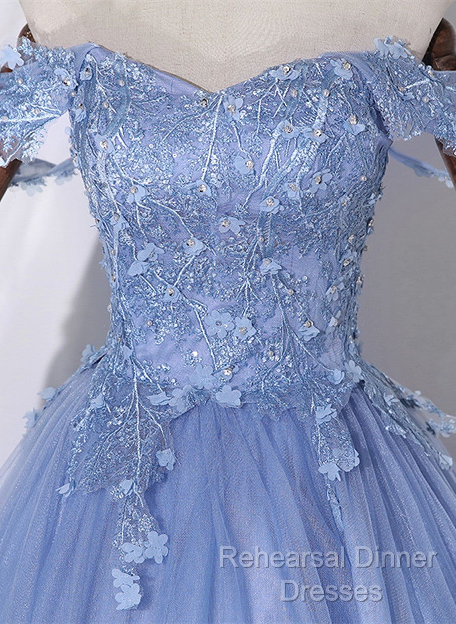 Blue Off Shoulder Tulle Party Dress With Lace, Long Formal Dress Sweet 16 Dress