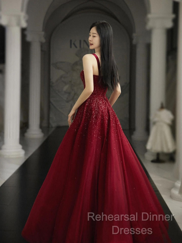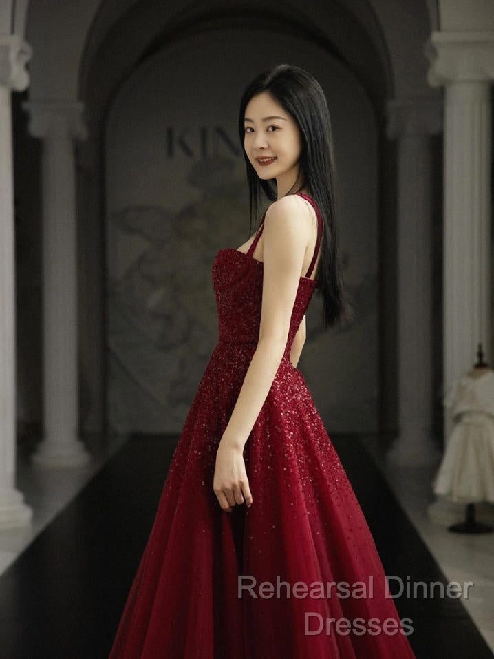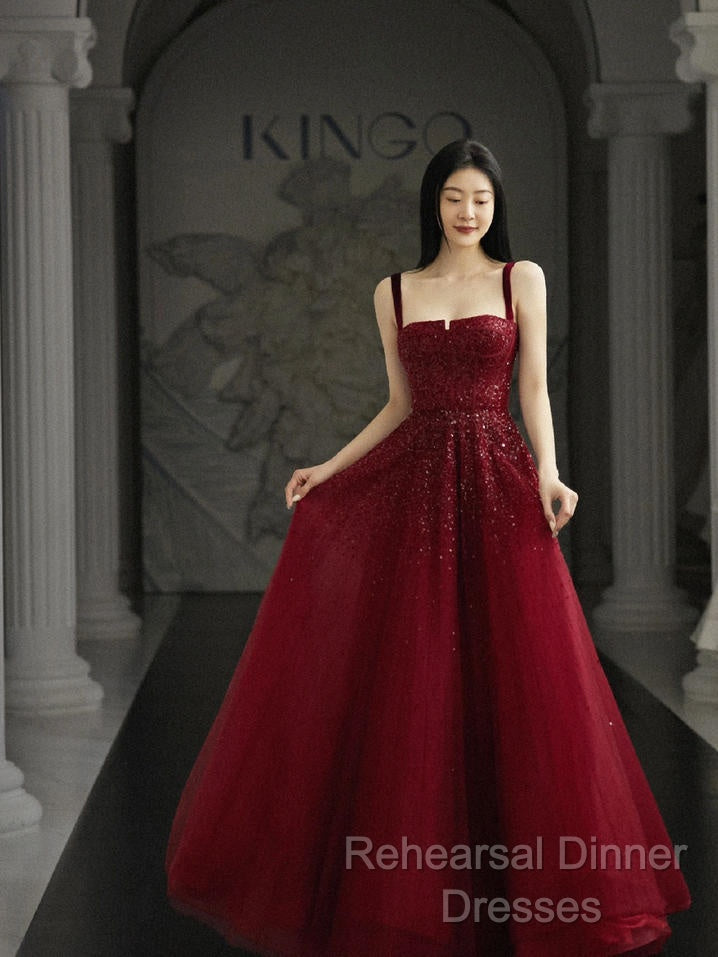 Burgundy Semi Formal Prom Dresses A Line Straps Tulle Evening Dresses