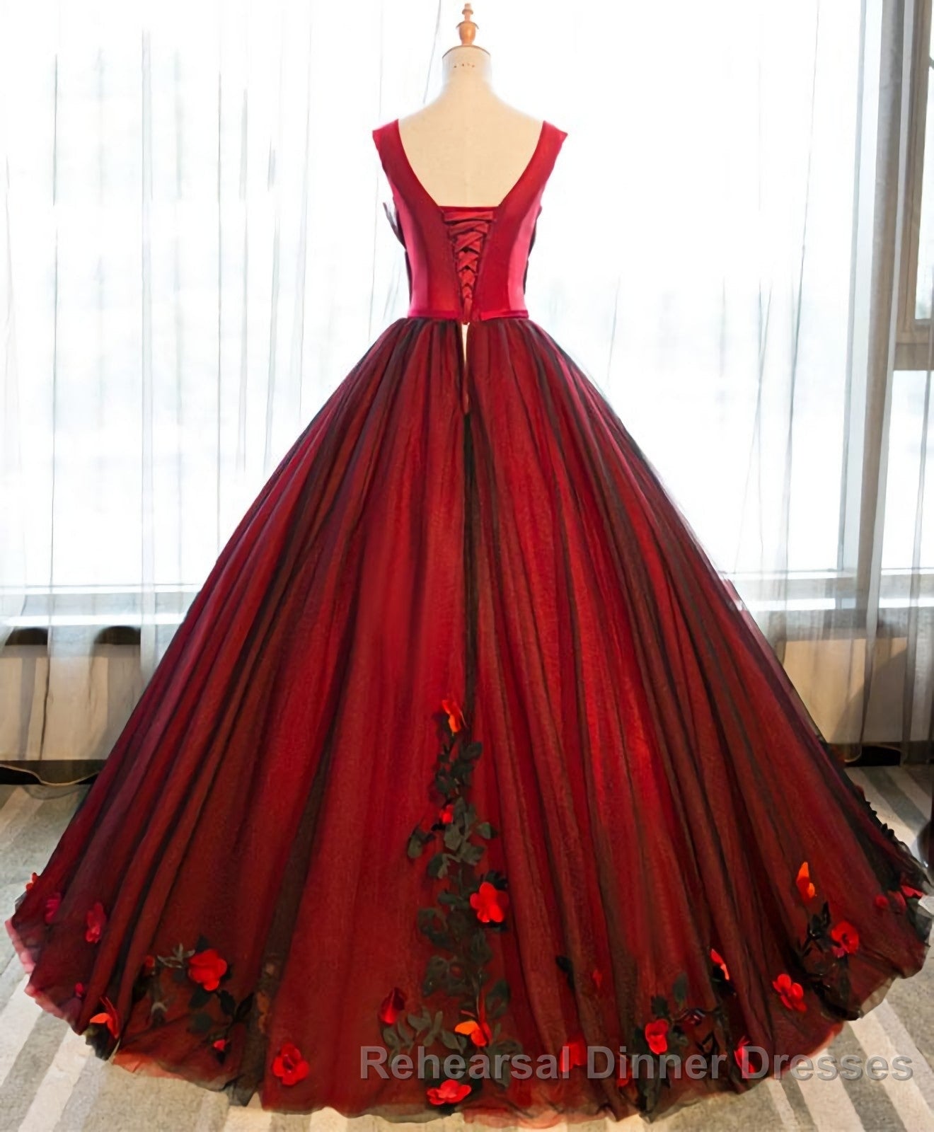 Burgundy Round Neck Tulle Lace Applique Long Semi Formal Prom Dress, Burgundy Evening Dress