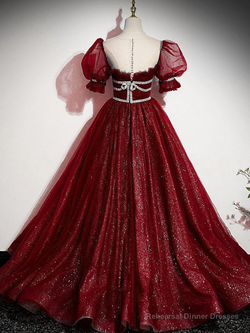 Burgundy Tulle Sequin Long Prom Dress, Burgundy Formal Evening Dresses