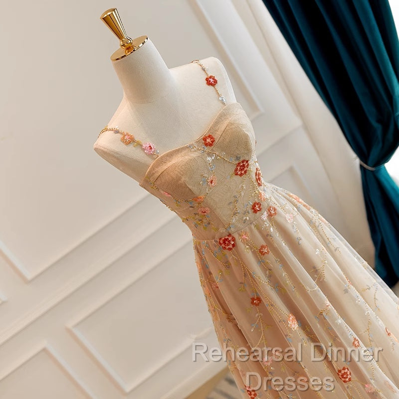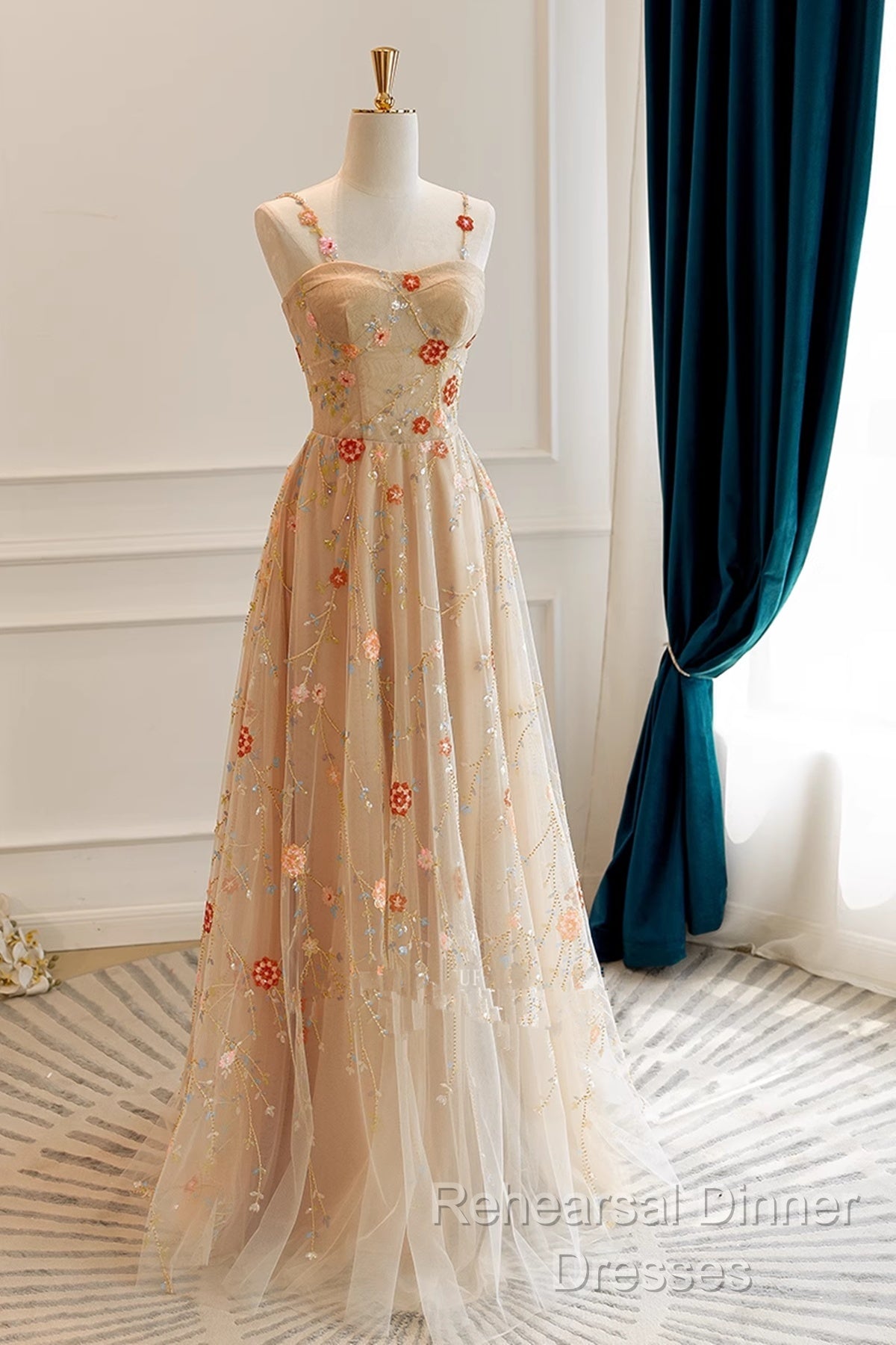 Champagne Floral Tulle Straps Sweetheart Wedding Party Dress, A-Line Tulle Long Semi Formal Prom Dress