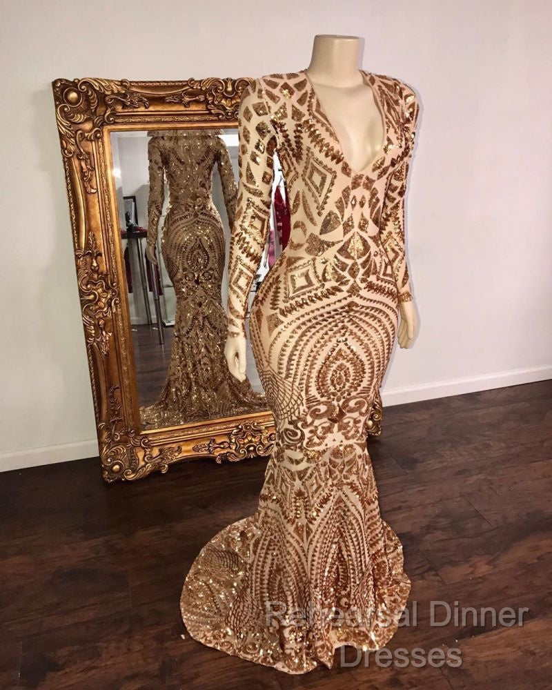 Champagne Sequins V-Neck Long Sleevess Mermaid Semi Formal Prom Dresses