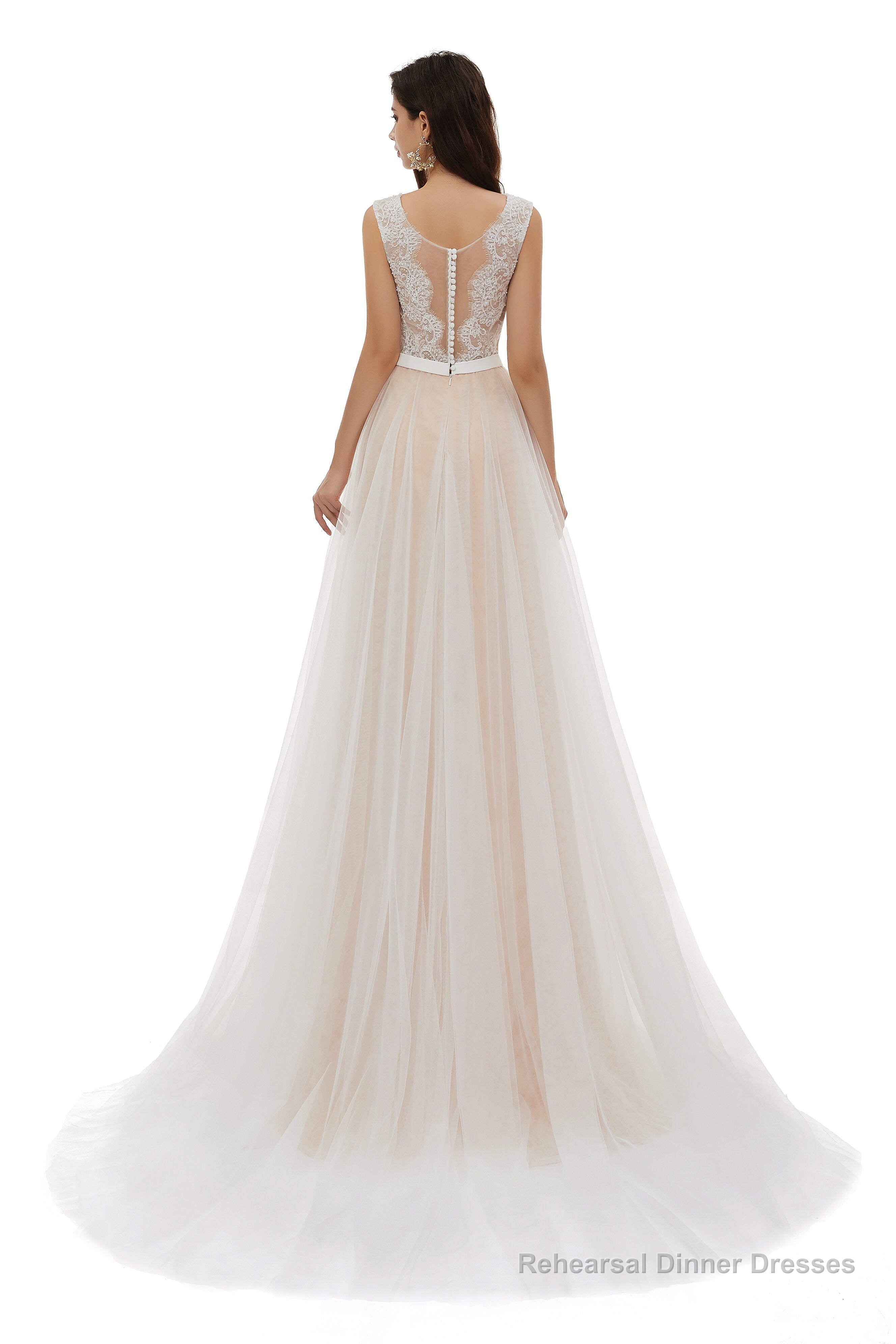 Champagne Tulle Scoop Neck Lace Appliques Beading Wedding Dresses