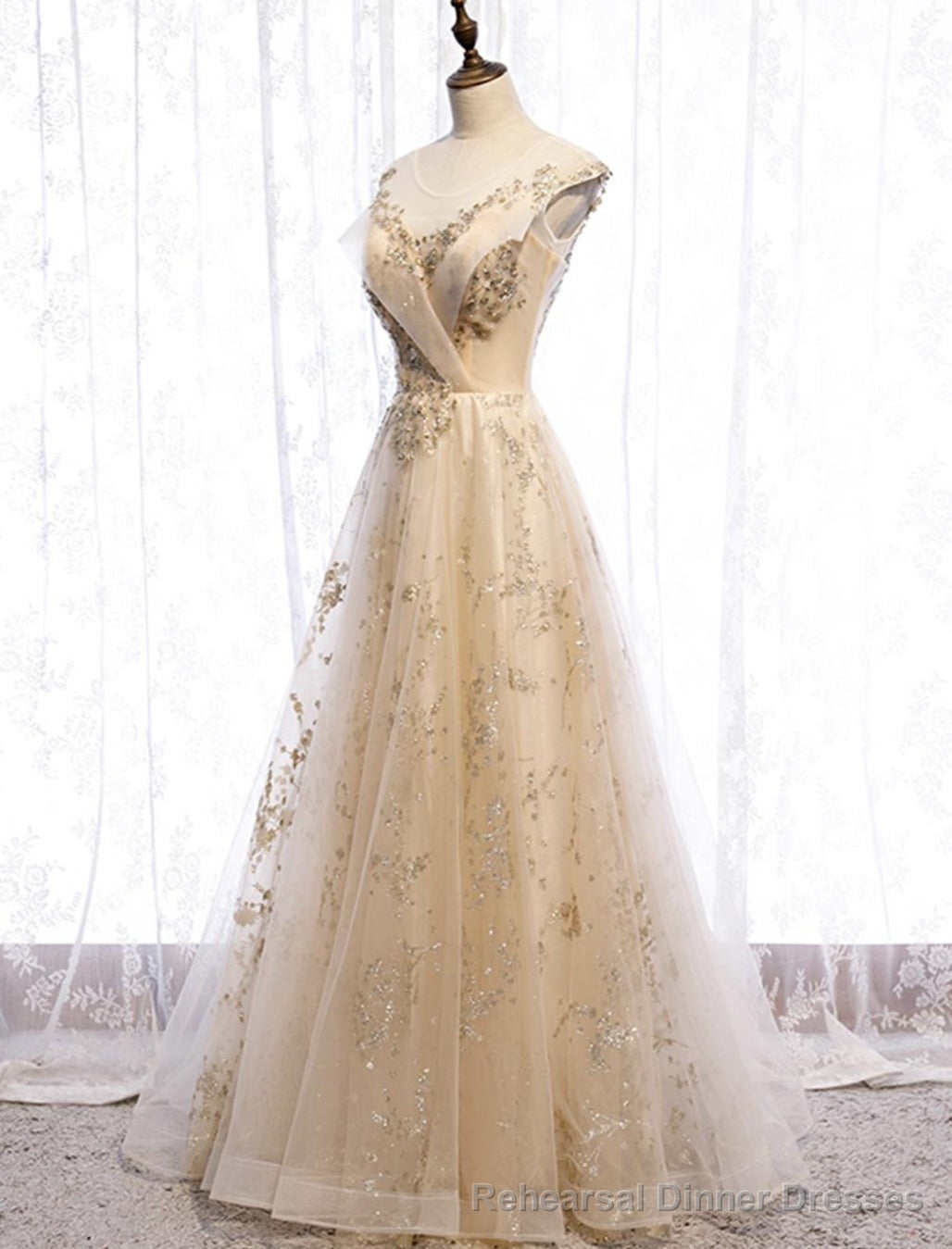 Champagne Tulle Sequins Long Prom Dress Evening Gown