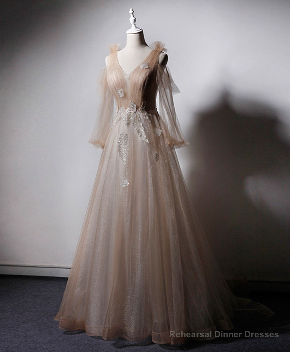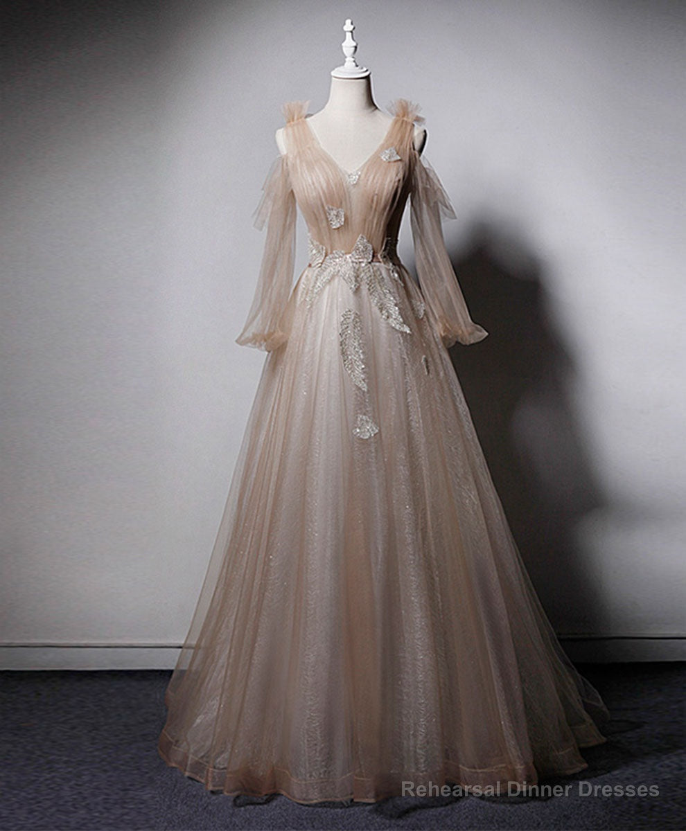 Champagne V Neck Tulle Lace Long Prom Dress, Champagne Formal Evening Dress