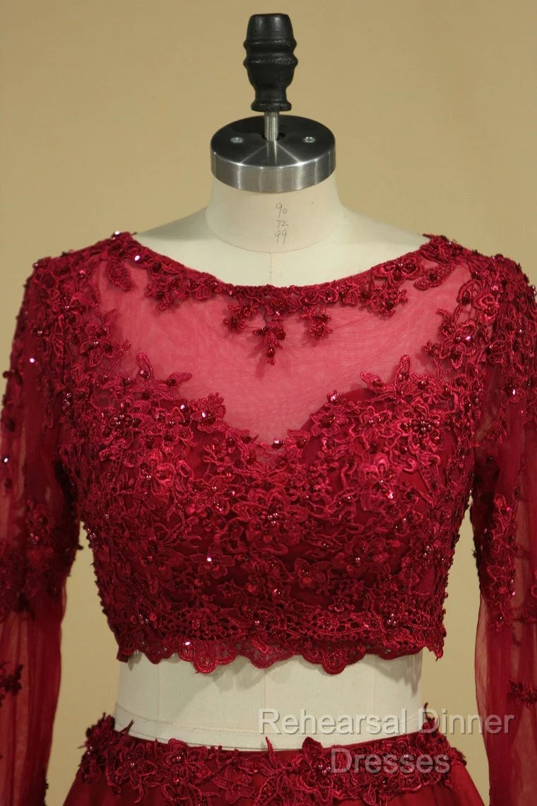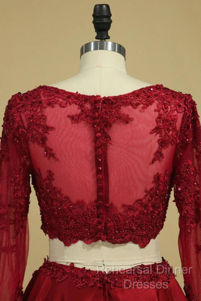 Cheap Burgundy Two-Piece Semi Formal Prom Dresses A Line Satin Lace Applique