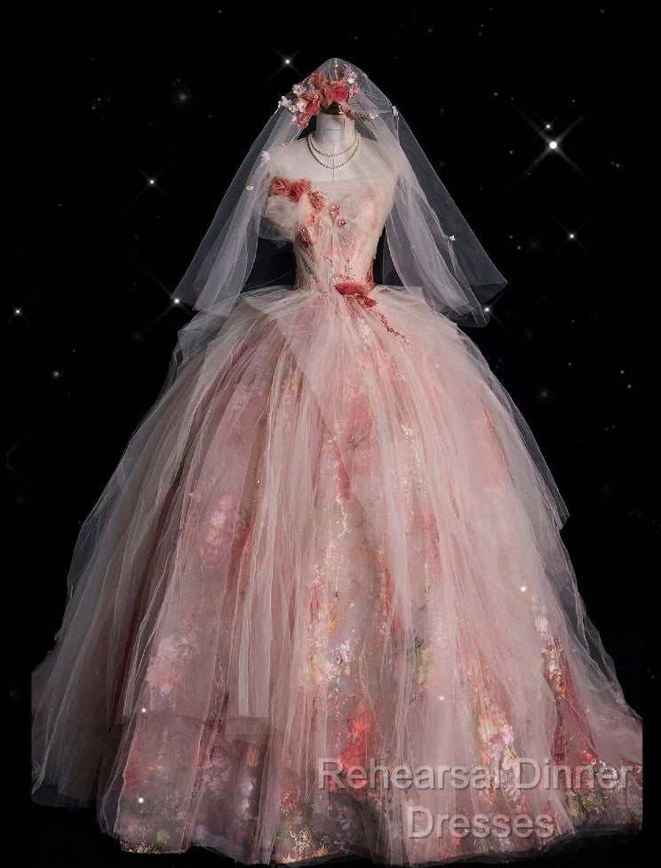 Classy Ball Gown Sweetheart Pink Floral Tulle Long Evening Dress Semi Formal Prom Dresses