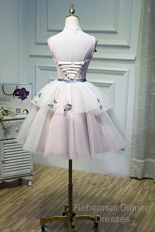 Cute Pink Tulle Short Flowers Lace Layers Formal Dresses, Pink Short Homecoming Dresses