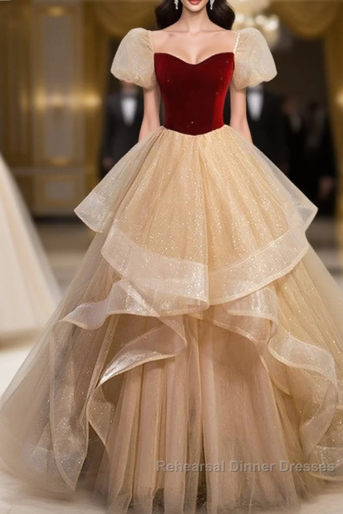 Elegant Burgundy Sparkling Sequin Square Neck Fluffy Short Sleeved Ball Dress, Burgundy Princess Sheer Backless Strap, Floor Length Layered Ruffle Edge Semi Formal Prom Dress