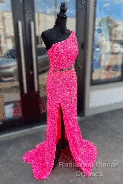 Fuchsia Sequins One Shoulder Cut-Out Tassels Long Semi Formal Prom Dress With Slit