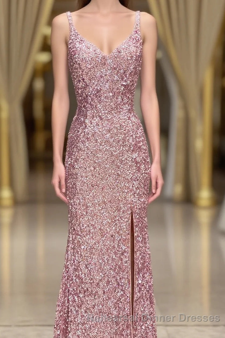Gorgeous Mermaid V-Neck Pearl Pink Long Semi Formal Prom Dress with Slit