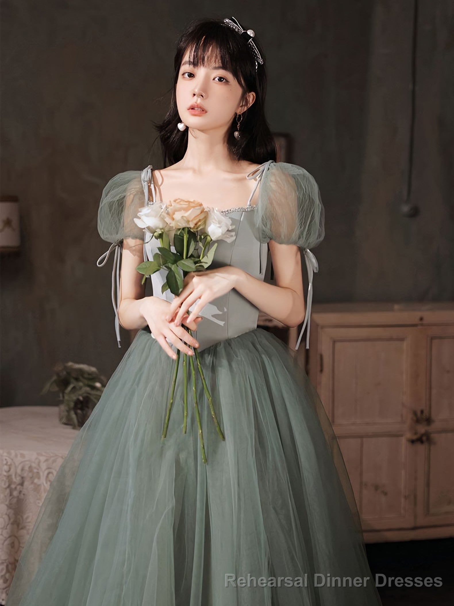 Gray Green Tulle Long Prom Dress Green Tulle Formal Dress