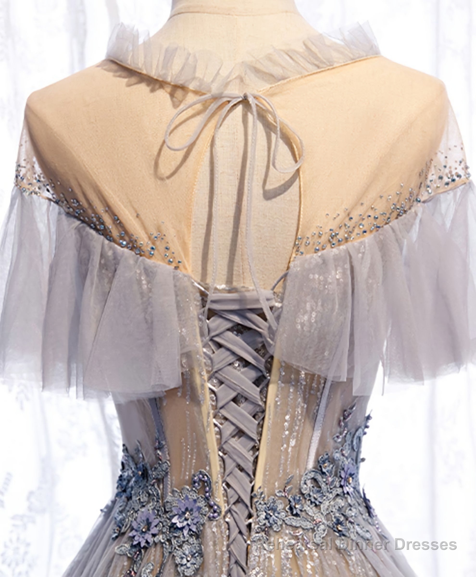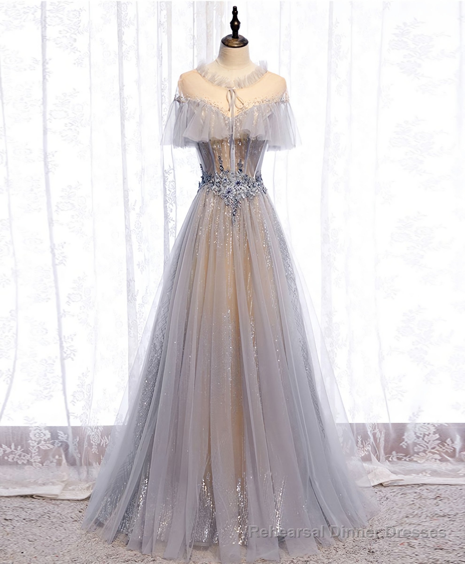 Gray Tulle Lace Long Prom Dress, Gray Tulle Formal Dress, 3