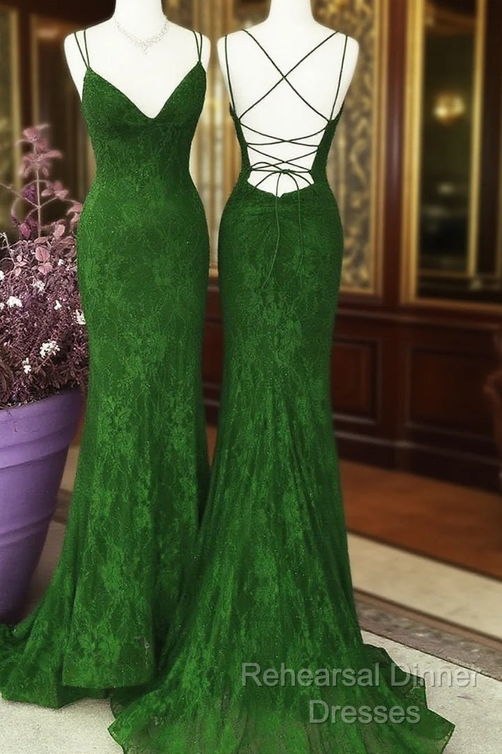 Green Lace Mermaid Straps Long Party Dress, Green Lace Wedding Party Dress
