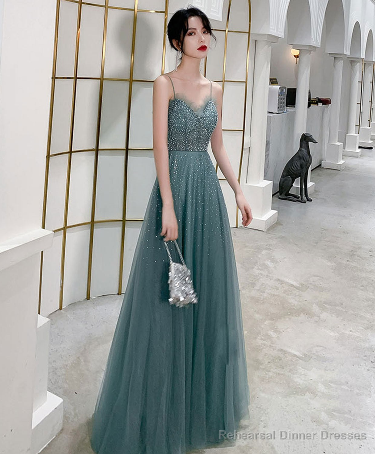 Green Sweetheart Neck Tulle Sequin Long Prom Dress, Tulle Graduation Dress