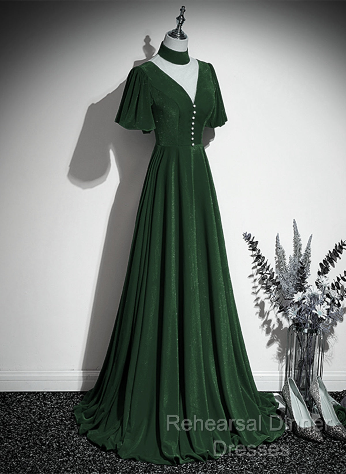 Green Velvet A-Line Short Sleeves Long Party Dress, Green Long Semi Formal Prom Dress