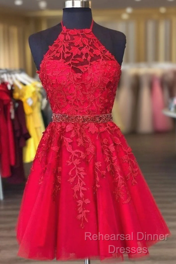 Halter Short Red Homecoming Dress With Lace Appliques And Beaded Band