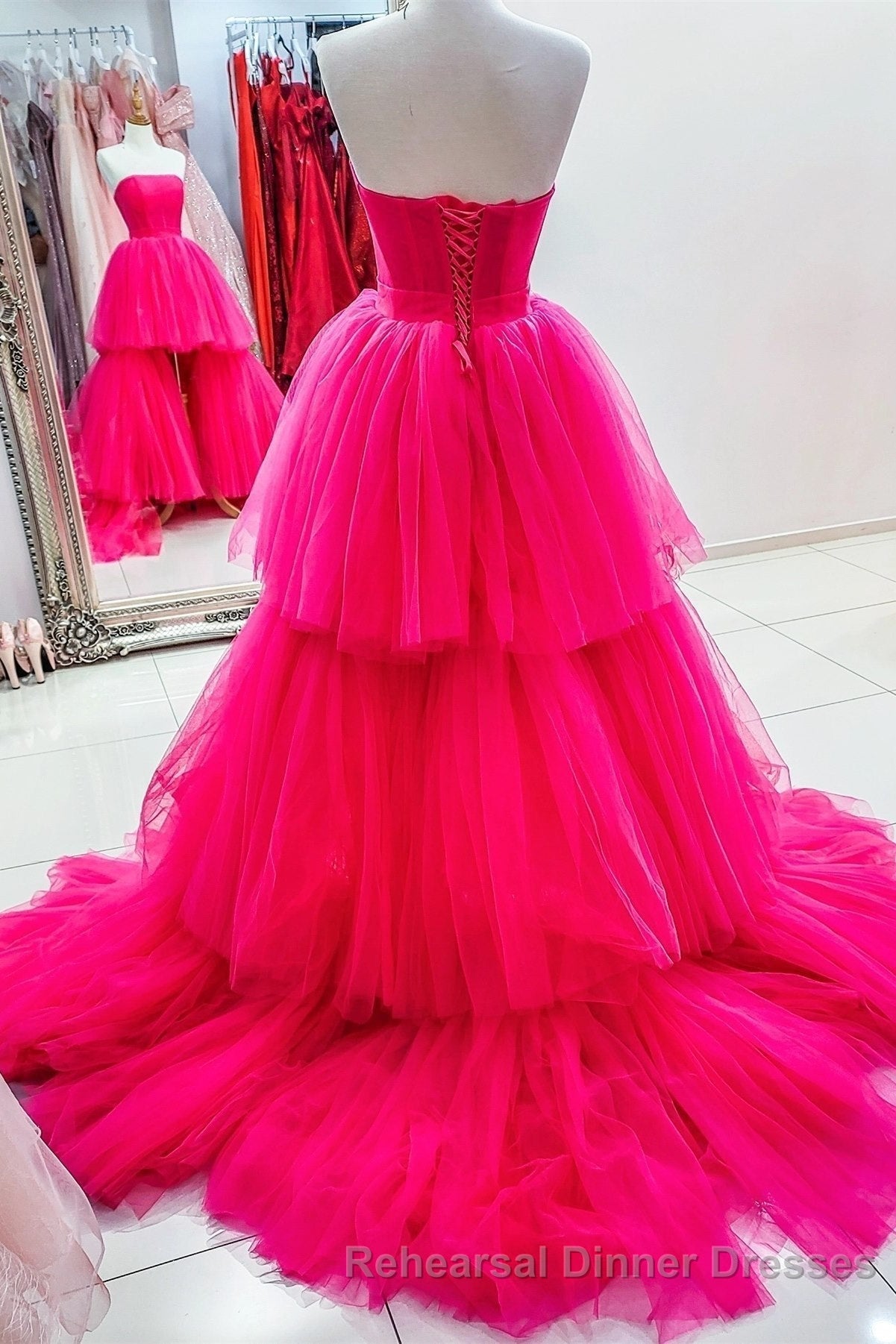 High Low Hot Pink Strapless Semi Formal Prom Gown