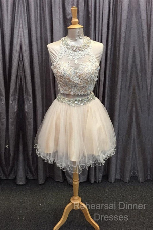 Light Champagne Tulle Lace Beading Homecoming Dresses Two Piece Style