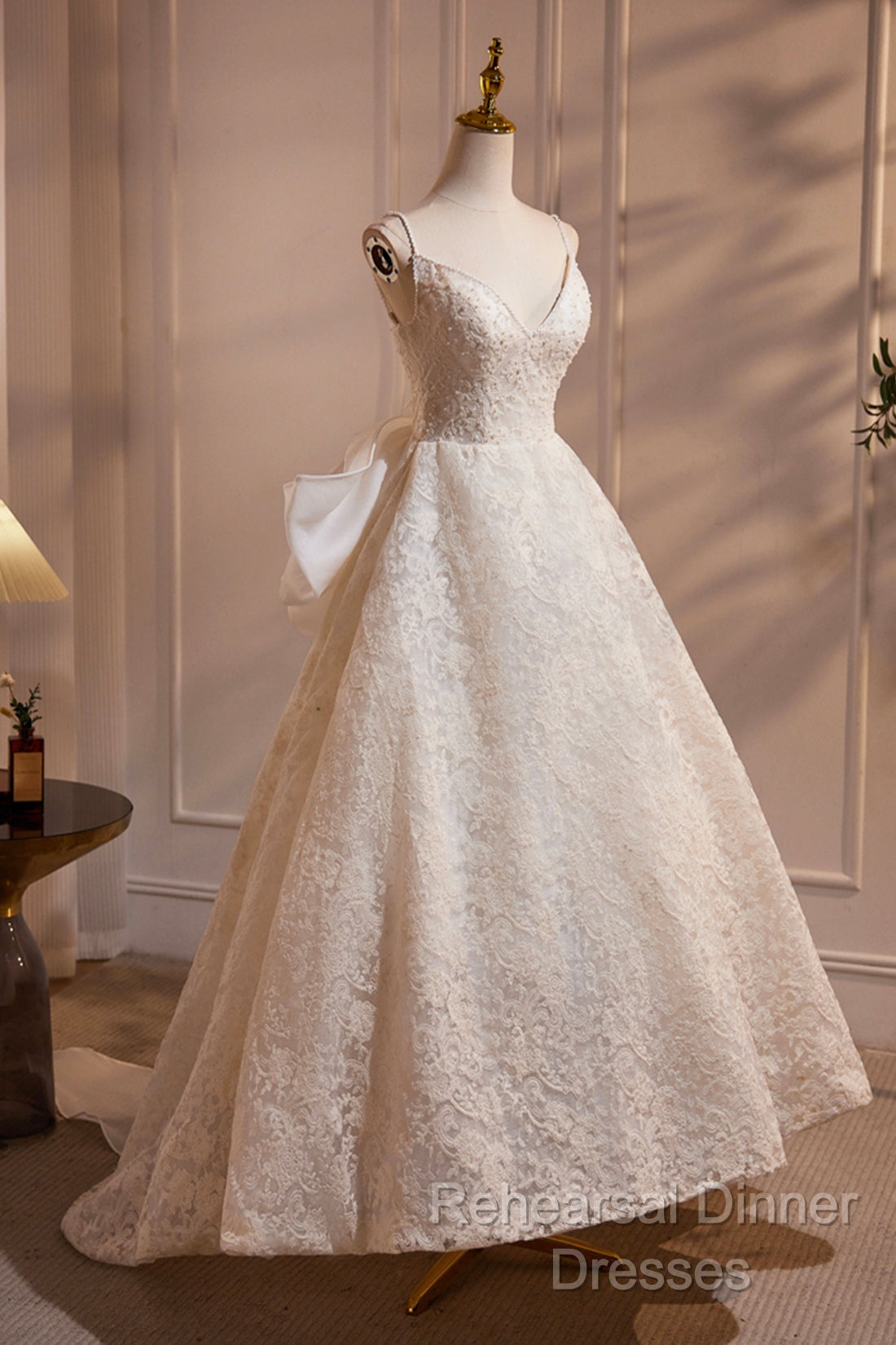 Light Champagne V-Neck Lace Long Semi Formal Prom Dress, A-Line Spaghetti Straps Backless Party Dress With Bow