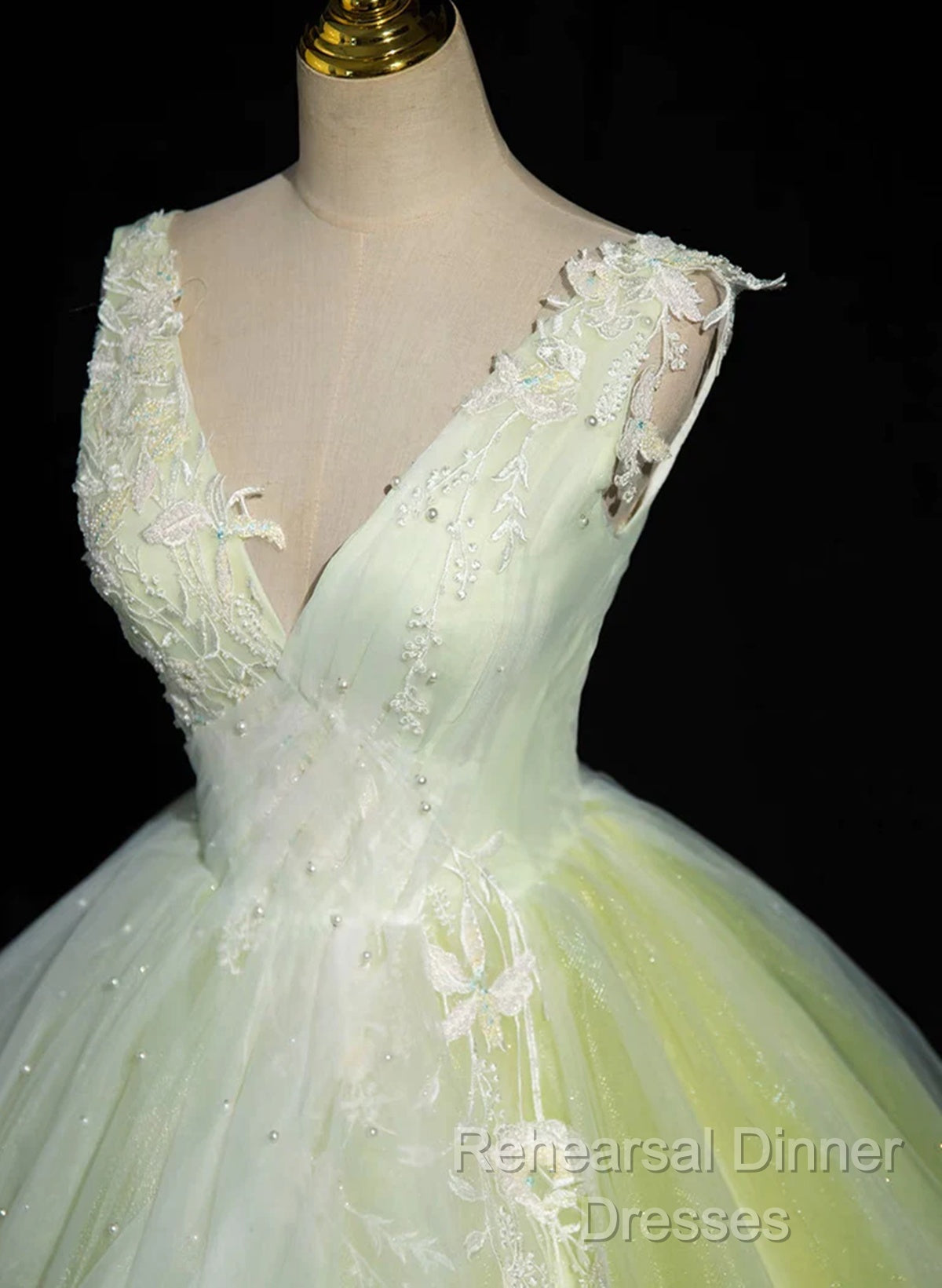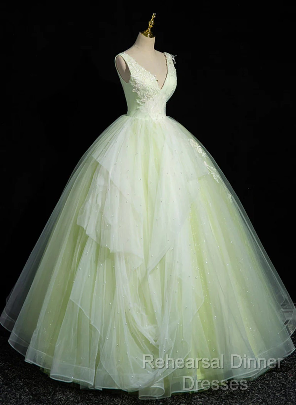 Light Green V-Neckline Tulle Long Party Dress, Light Green Sweet 16 Dress