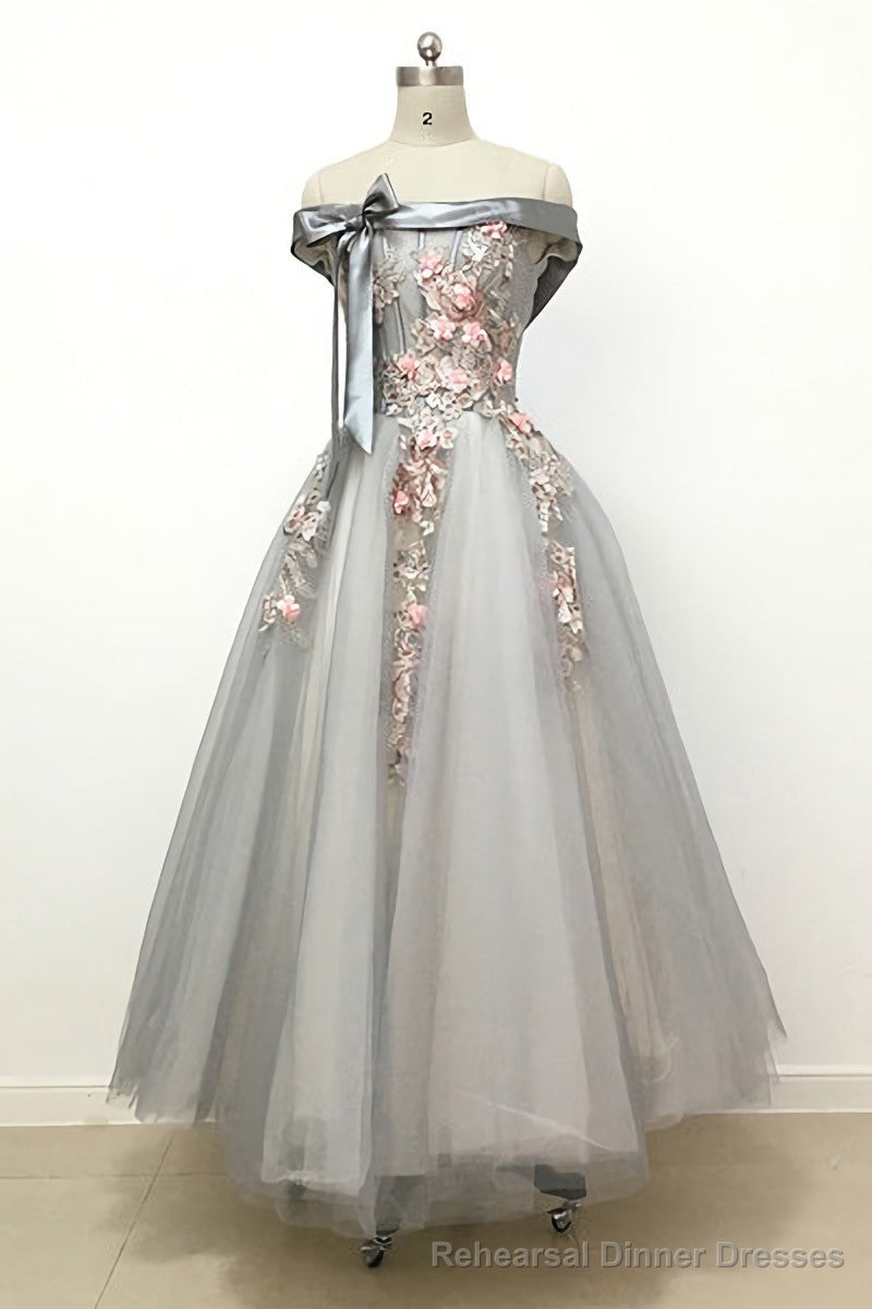 Light Grey Tulle Off Shoulder Flower Lace A Line Prom Dresses