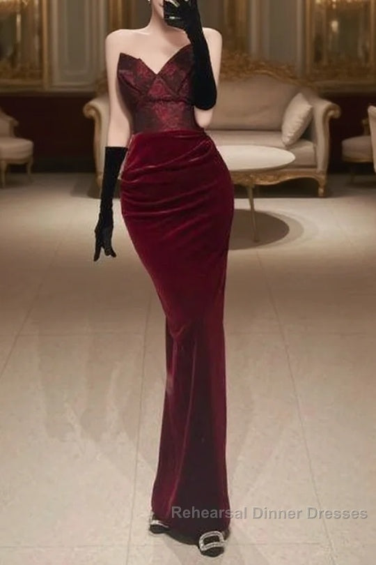 Mermaid Strapless Burgundy Long Lace Semi Formal Prom Dress